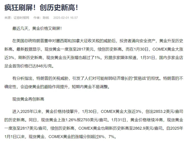 比如2025年1月底,懂王威迫对墨西哥、加拿猛入口的商品征收25%的关税。阛阓担忧生意战重燃,避险资金涌入黄金,股东金价冲突2800好意思元/盎司,创其时历史新高。