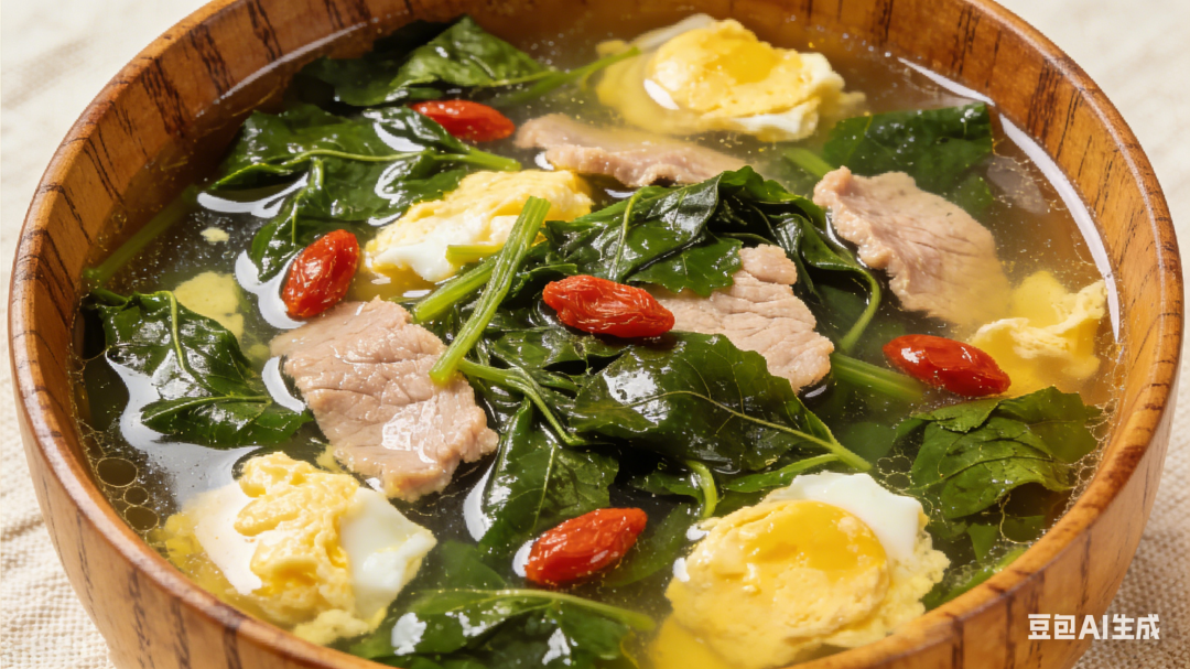 作念法:枸杞浸泡10分钟,与桑叶、瘦肉、姜丝沿路加水煮滚,出锅前加入两个打散的鸡蛋,煮熟后调味即可。