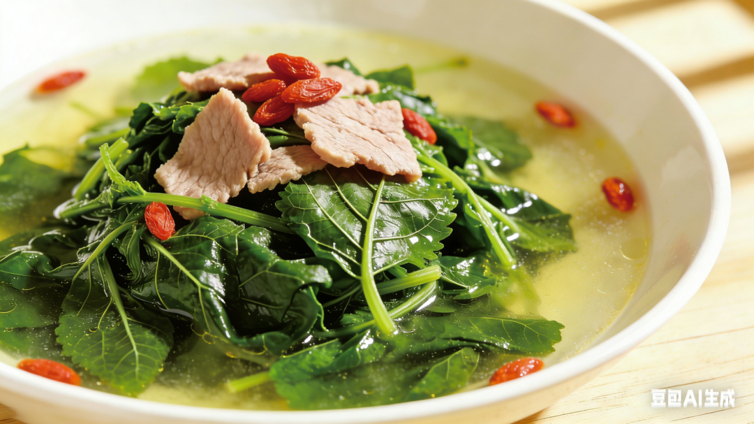 作念法:桑叶洗净,焯水时加极少盐和油保抓翠绿,捞出备用;另起锅炒香蒜片、姜丝,加入肉片和皮蛋丁炒至变色,倒入500毫升滚水煮3分钟,加盐和白胡椒粉调味,撒上枸杞,将汤汁浇在桑叶上即可。