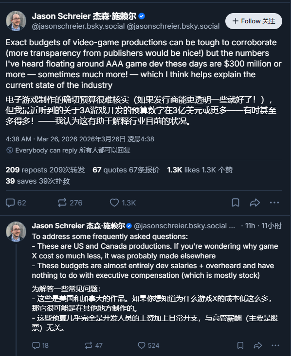 杰森 · 施赖尔指出,上述资本不包含大型游戏责任室高管的奖金。也即是说,在频频三到四年的开发周期内,仅开发者薪资过甚他与游戏开发平直联系的用度,就已达到 3 亿好意思元甚而更高。