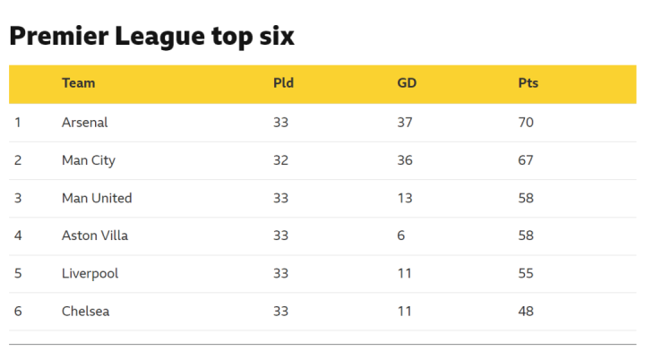 阿森纳和曼城早已确保前五的名次,曼联、维拉和利物浦将拿走另外3个参赛限额,下赛季英格兰仍然至少有5支欧冠参赛队。