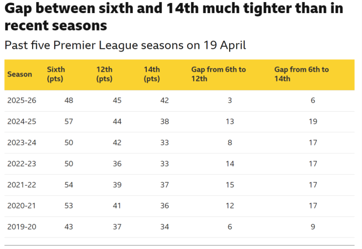 昨年同时,英超第六名和第14名依然有多达19分的分差,更早之前的三个赛季,则王人是17分。在英超创立后的34个赛季中,4月19日时名次联赛第六的球队与名秩序12的球队之间的对等分差为13.3分;名秩序六的球队与名秩序14的球队之间的对等分差则为16.5分。