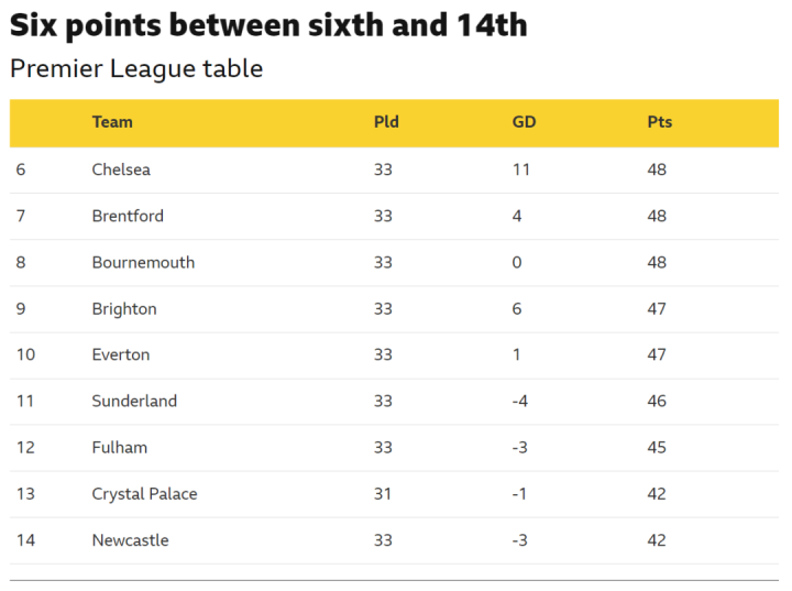 不外,这个赛季英超中游竞争浓烈,第六名切尔西和第14名纽卡斯尔联之间唯有6分差距。切尔西最近6场输了5场,积48分与布伦特福德和伯恩茅斯磋商。数据流露,这照实是积年来积分榜中游缠斗最浓烈的一年!