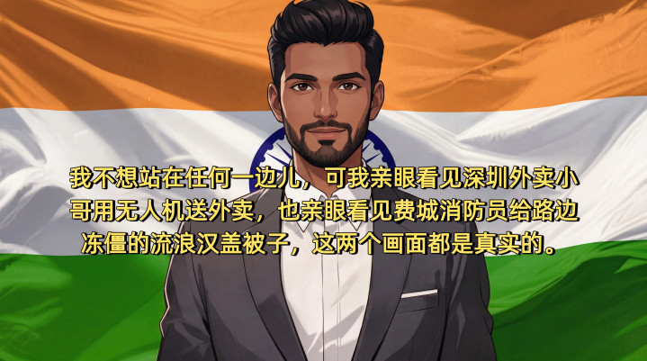 驳斥区有一条点赞很高的留言,是一位自称在深圳责任过3年的印度工程师说的,“我不思站在职何一边儿,可我亲眼看见深圳外卖小哥用无东谈主机送外卖,也亲眼看见费城消防员给路边冻僵的流浪汉盖被子,这两个画面齐是真实的。”