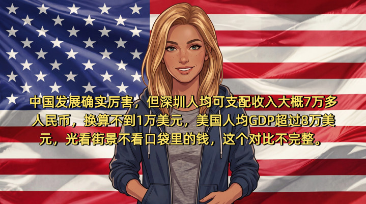 在YouTube驳斥区,有东谈主写谈,“中国发展如实厉害,但深圳东谈主均可讹诈收入能够7万多东谈主民币,换算不到1万好意思元,好意思国东谈主均GDP格外8万好意思元,光看街景不看口袋里的钱,这个对比不竣工。”