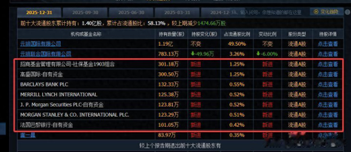 2025年底,社保基金1903组合,抓有新进公司301.18万股,位列公司第3大流畅鼓舞;而高盛、巴克莱、好意思林外洋、小摩、大摩和法国巴黎银行,则永别新进了300.50万股、132.33万股、125.38万股、123.81万股、123.29万股和101.05万股,位列公司第4~第9大流畅鼓舞。