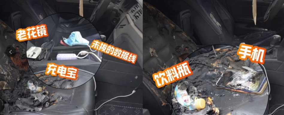 ▲浙江一车主留传在副驾驶座椅上的手机,因永劫刻暴晒发生了爆炸,且车内还存在饮料瓶、充电宝、老花镜等多种潜在“定时炸弹”。