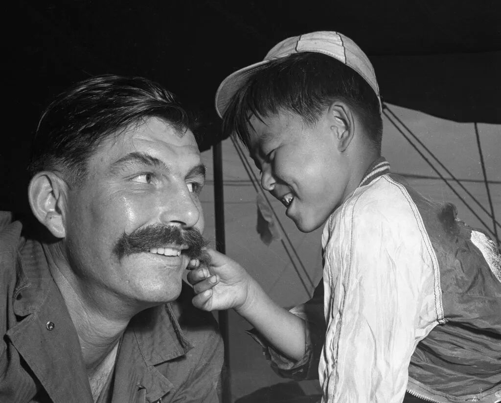 ▲20世纪中期,被好意思国陆军第24步兵师收养的韩国小男孩“艾尔”对来自科罗拉多州丹佛的沃尔特·温斯坦中士的八字胡很感意思意思。视觉中国丨图