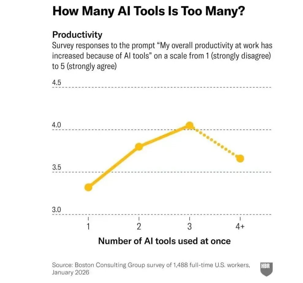 第三,不是使用越来越多的AI器具,出产力就越高。该计划发现,当职工从同期使用一种AI器具到三种时,出产力会显赫提高,但当使用三种器具之后,出产力评分就着落了。