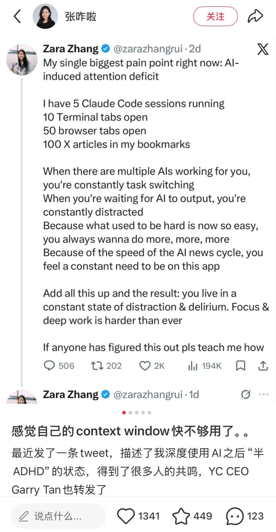 AI驰名博方针咋啦最近的一篇博文让我很有感叹,她说我方深度使用AI之后,咫尺依然是‘半ADHD’的气象,AI的高下文窗口(Context Window)依然不是瓶颈了,澳门娱乐平台但东谈主类的高下文窗口快不够用了。