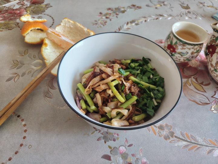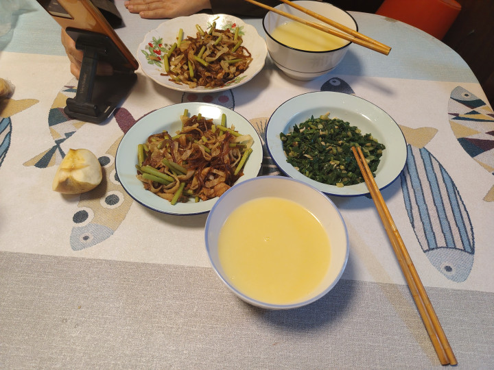 晚上喝了半碗玉米糊,少吃了半小盘炒饼,凉拌了点蒜苔尾巴,加了橄榄油和山西老陈醋。